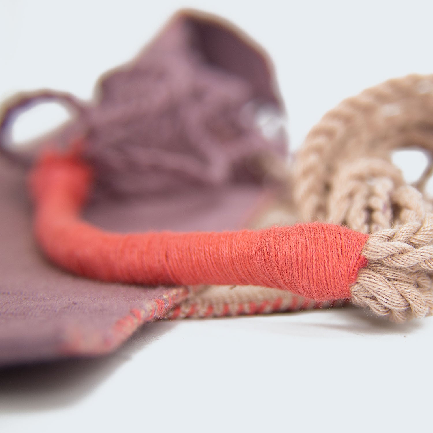 The waist loom is set up by tying the ends of the warp to two pieces of wood or sticks called "enjulios," which support the weaving and define its width. The upper end of the loom is tied to a tree, while the other end is held at the waist with a "mecapal," a type of sash that the weaver secures around her waist to tension the loom. Through a constant back-and-forth of alternating threads, rectangular canvases are produced, which are widened through joins or rounds.
