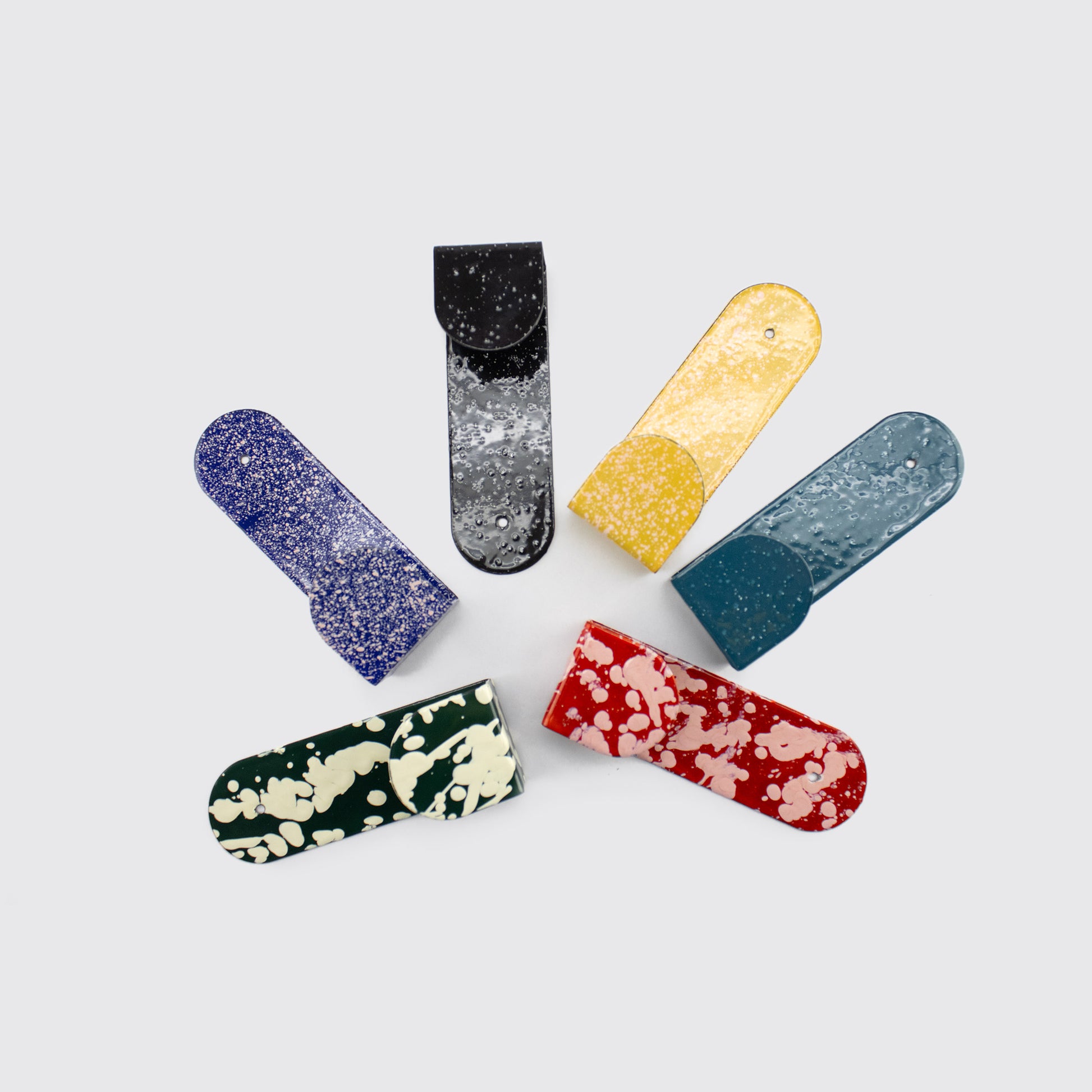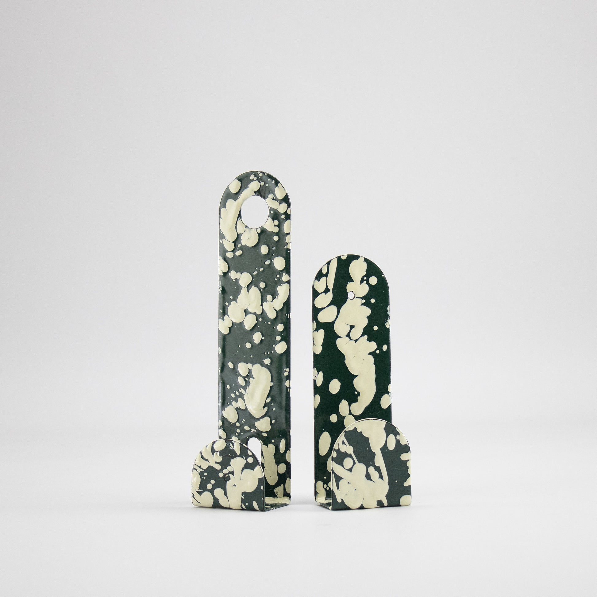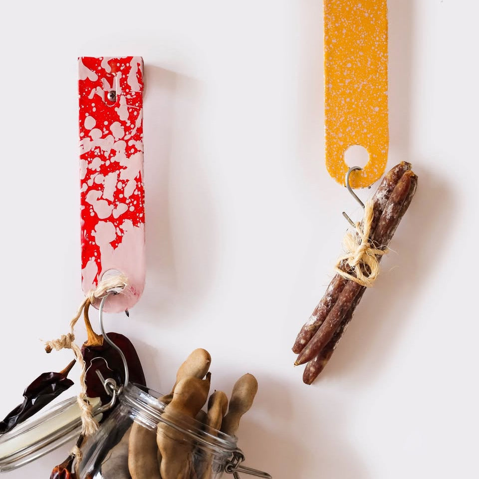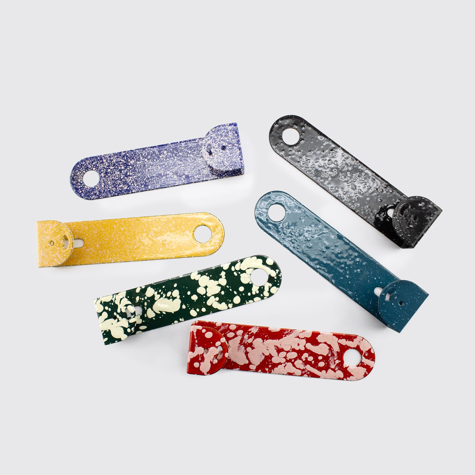 Available in 6 different finishes, each coat rack can be used individually or combined to create dynamic compositions on entryway walls, kitchens, bathrooms, or bedrooms. The contrast between its simple shape and the speckled finishes adds a contemporary touch that works well with modern, utilitarian, or eclectic spaces.