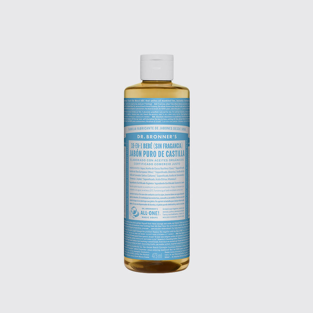 Rostro: moje el rostro con agua, frote 5 gotas de jabón líquido en la palma de la mano, aplique sobre el rostro con movimientos circulares suaves y enjuague. Cuerpo: aplique una cantidad pequeña sobre un paño húmedo o esponja exfoliante. Manos: vierta unas gotas de jabón en las manos para formar suficiente espuma. Brochas para maquillaje: vierta unas gotas de jabón y agua en las cerdas hasta remover los residuos. Afeitar: vierta unas gotas de jabón entre las manos mojadas, frote para formar espuma y luego aplíquelo sobre el área que desea afeitar. Diluir aceites y esencias de baño: Nuestro jabón líquido está elaborado de puros aceites vegetales saponificados y el de bebé contiene el doble de aceite de olivo por lo que es ideal para diluir tus aceites esenciales antes de echarlos al agua. Con Dr. Bronner’s puedes preparar la cantidad que tu quieras y utilizarla a tu gusto.