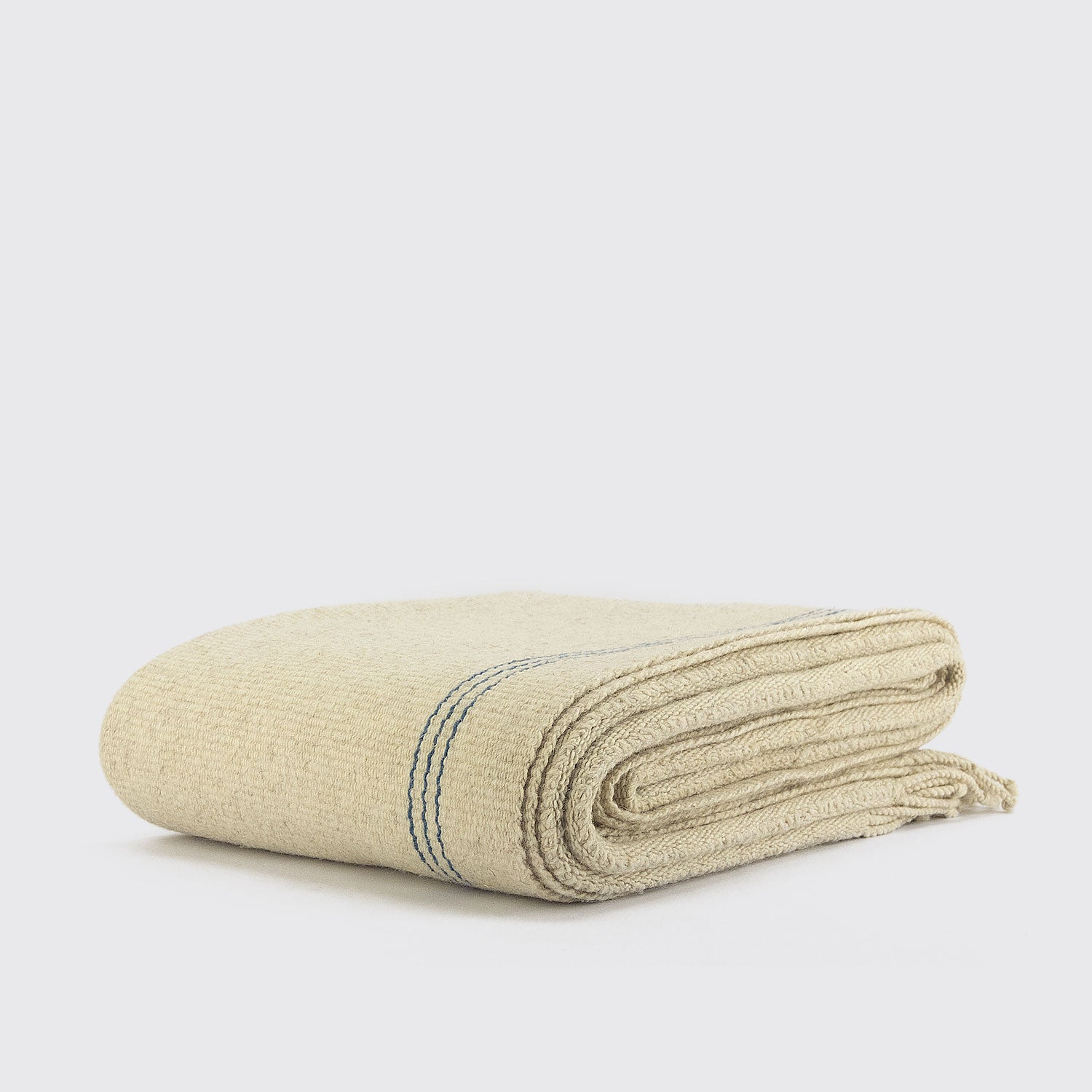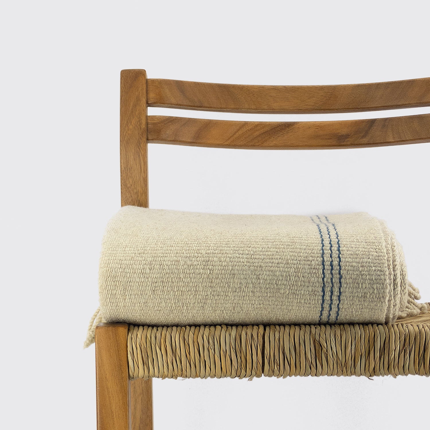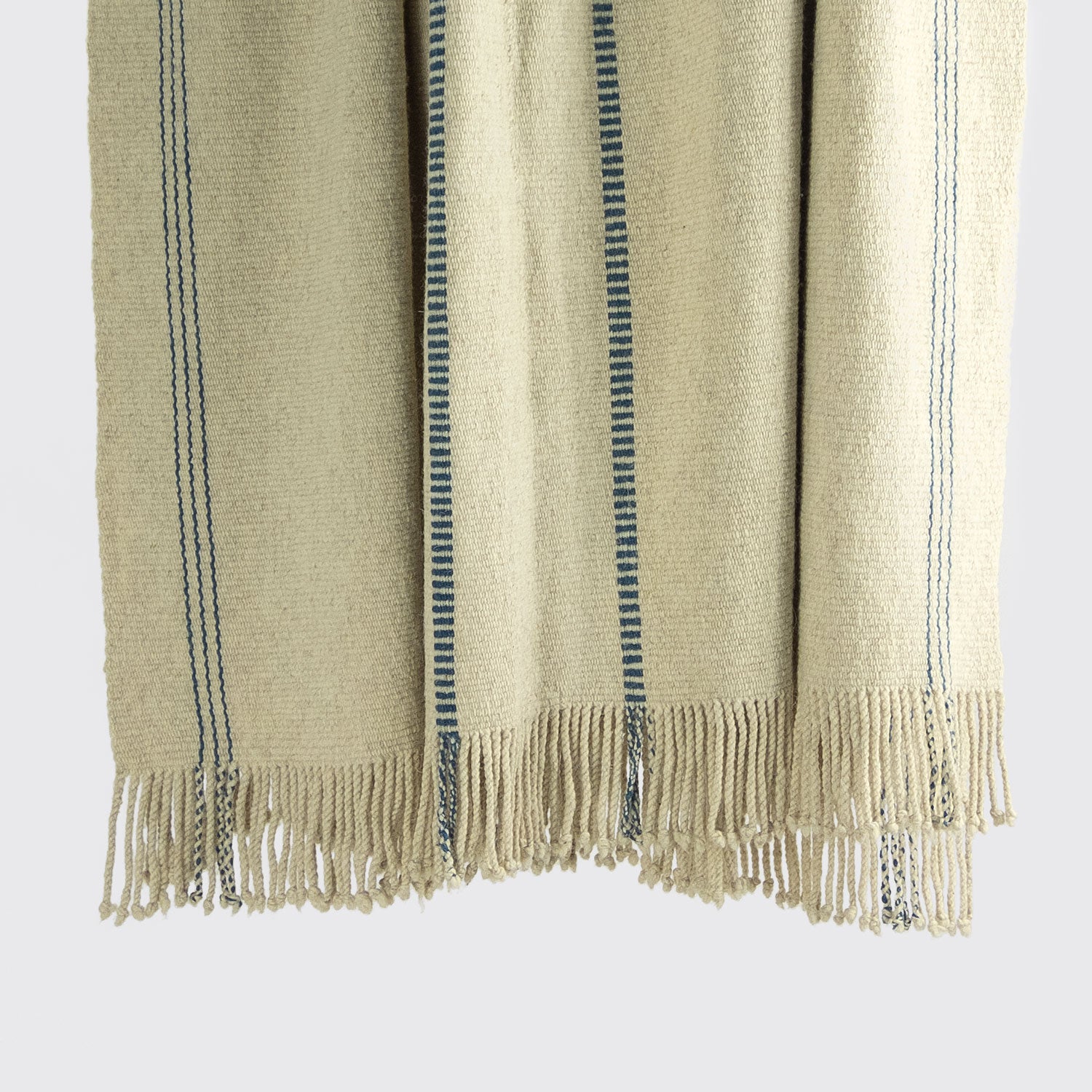 Pieza Singular. Cobija artesanal elaborado en telar de cintura por la artesana Petra Rivera Estrada, en Hueyapan, Morelos. Pieza única conformada por dos lienzos unidos que celebra las técnicas tradicionales y el talento de una artesana experta.