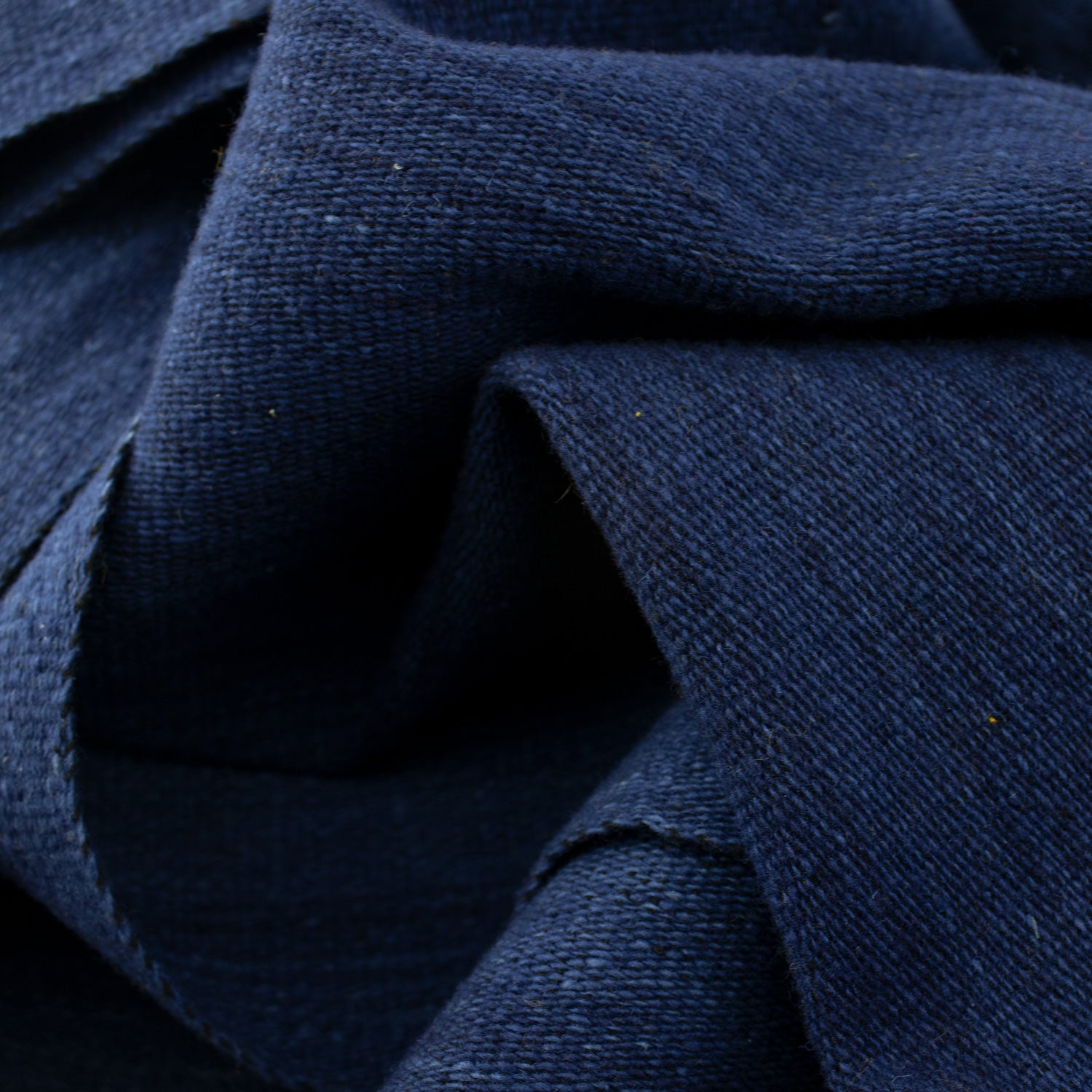 Pieza Singular. Sarape largo elaborado en telar de cintura por la artesana Petra Rivera Estrada, en Hueyapan, Morelos. Textil compuesto por dos piezas unidas, cuyo ancho corresponde al de la cintura de la propia artesana, dejando así su firma en esta pieza. Fue hilado a mano y llevó un proceso de cinco teñidos con añil para conseguir su tonalidad azul final.
