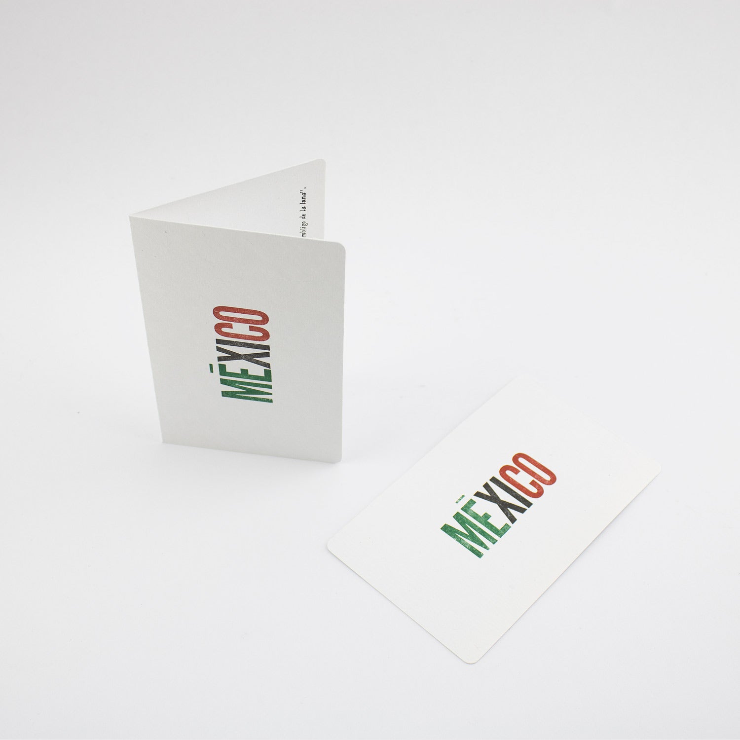 "MÉXICO" Impresión formato postal o tarjeta. Tamaño 9x15 cm. Papel tornasol de 180 gramos. Hecho 100% a mano con una “Old Press” de la marca Chandler&Price del año 1885, imprenta de tipos móviles de LaPress. Hecho en Pachuca, Hidalgo, México. “Memoria colectiva” es una serie de tarjetas pensadas en la asociación de palabras con meses, colores y contenidos en español impresas con su significado proveniente del diccionario.