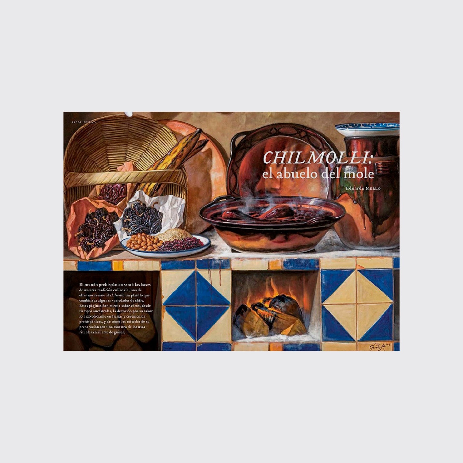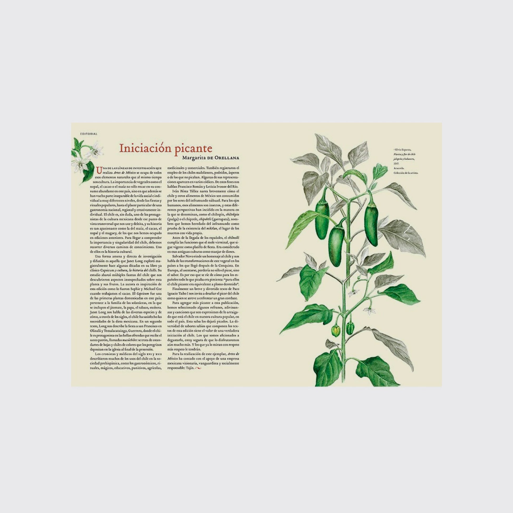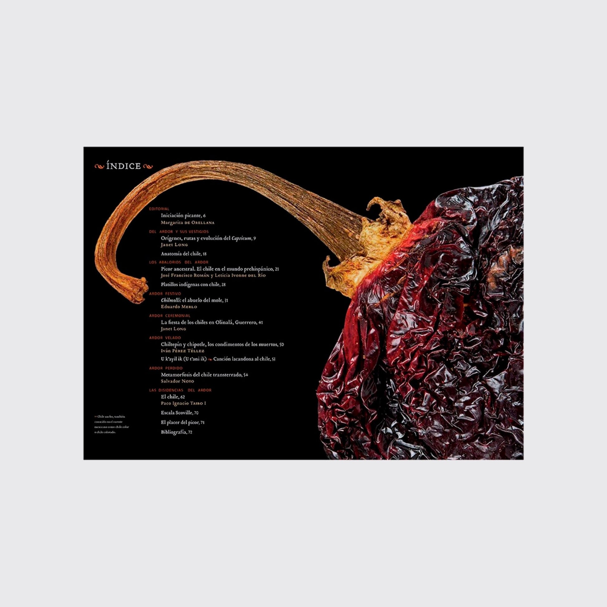 Chili has been one of the essential ingredients in Mexican cuisine since pre-Hispanic times. The adaptability of this seed to transform into other varieties and adapt to new environments, the different degrees of spiciness, the medicinal properties and the historical, cultural and ritual background that has been created around the chili are some of the themes that motivate these pages. These visions are also accompanied by proverbs, riddles, popular songs, stories and texts from missionaries and travelers of the 16th century that complement the cultural richness that chili awakens in our country.