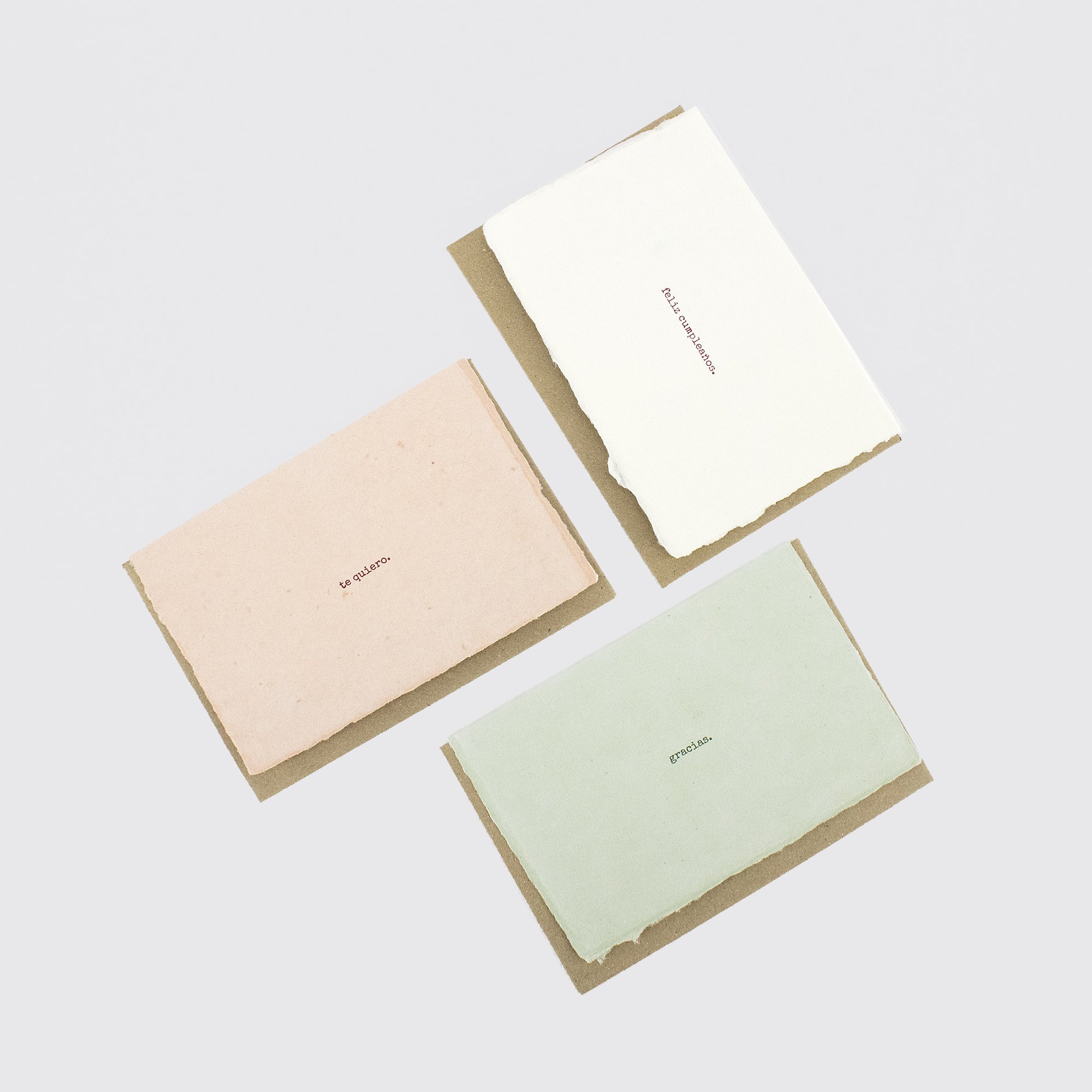 Celebrate, express gratitude, or show affection with these greeting cards, handcrafted from handmade cardstock, giving them a unique texture and natural finish. Available in three versions: “Feliz cumpleaños,” “Gracias,” and “Te quiero.”